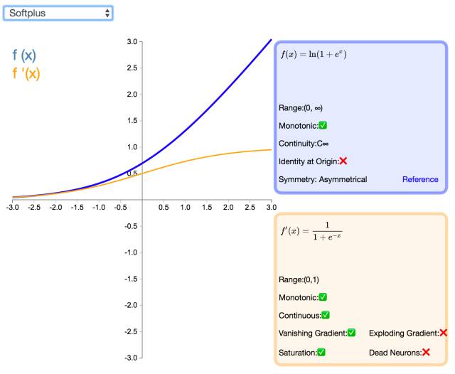 作为 ReLU 的一个不错的替代选择,SoftPlus 能够返回任何大于 0 的值。与 ReLU 不同,SoftPlus 的导数是连续的、非零的,无处不在,从而防止出现静默神经元。然而,SoftPlus 另一个不同于 ReLU 的地方在于其不对称性,不以零为中心,这兴许会妨碍学习。此外,由于导数常常小于 1,也可能出现梯度消失的问题。