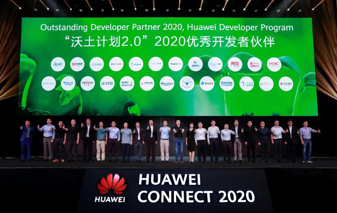 2020 年 9 月 25 日,在华为全联接 2020 上,华为云业务总裁郑叶来、华为计算产品线总裁邓泰华,共同揭晓了 20 家“沃土计划 2.0”2020 优秀开发者伙伴。