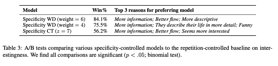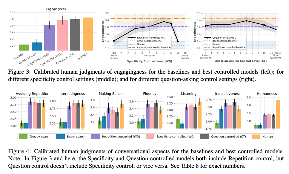作者提出:一个好的对话需要有以下特性:简洁与细节 持续主题与更换主题 问问题和回答问题,对应四种属性:重复性、独特性、回复相关性和问与答。在这部分内容中作者旨在设计通用且易于调整的的控制方法,研究了两种控制方法条件训练(conditional Traning)和加权解码(weighted decoding)。使用条件训练和加权解码来控制四个属性:repetition重复性、secificity特异性、response-relatedness反映相关性和question-asking提问。在测试该任务改进的效果子作者对28种模型配置进行了大规模的人工评估,并进行了人机对话以进行比较。
