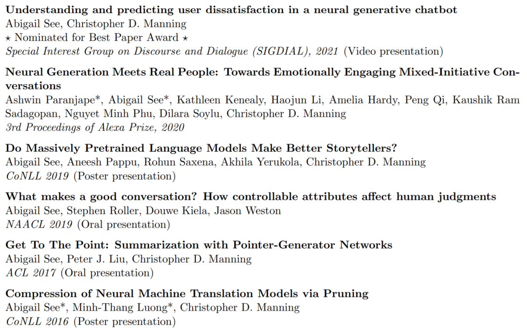 作者是刚刚8月份毕业于斯坦福的女博士Abigail See。Abigail 的研究方向是开放式的文本生成,导师是大名鼎鼎的 Chris Manning。目前在谷歌学术上已经拥有 2139 的引用量。同时,她也是斯坦福 AI Salon,AI woman 两个组织的主要负责人,还连续担任过是斯坦福 cs224n (NLP导论)的助教组长。