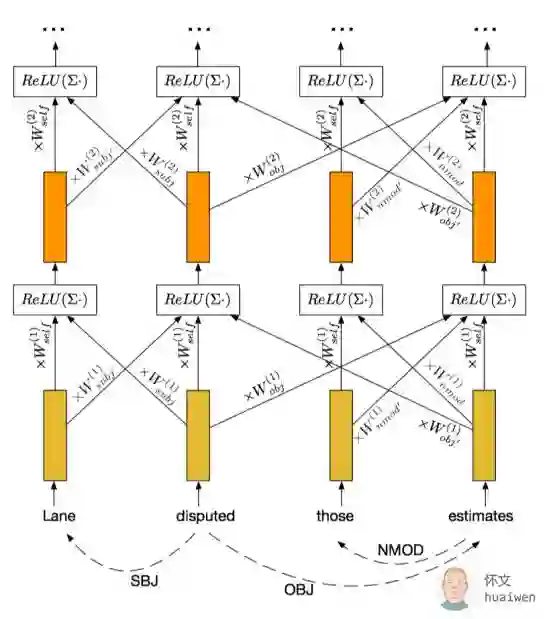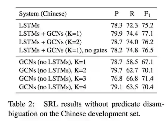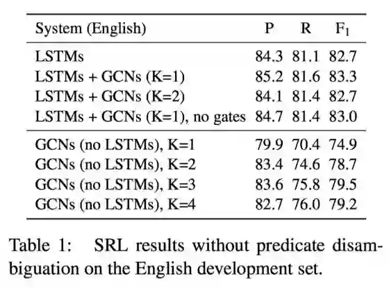 基于上述观察,Deigo 等人提出了一种基于图卷积网络(GCNs)的方法,来做语义角色标注,使用 GCN来编码句法依存树,从而产生该句子中单词的潜在特征表示。文章观察到GCN层与LSTM层是互补的:当GCN层和LSTM层叠加时,他们的性能获得了最新的 state-of-the-art。