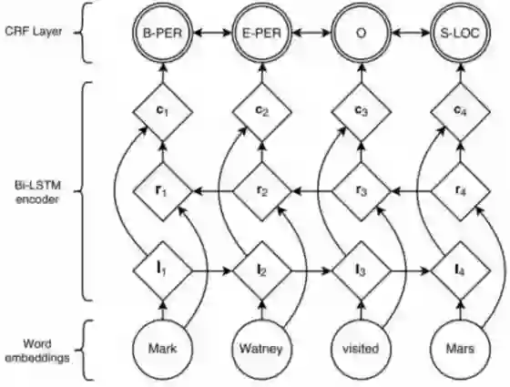 这个问题, 如果在给定谓词(predicate) 的情况下, 可以转化为,给一个句子打标签, 即序列标注模型。而 Bi-LSTM在序列标注模型中,可谓是如日中天,目前的 state-of-the-arts 基本都是基于这个。但测报的使用序列标注模型, 比如经典的下图结构:
