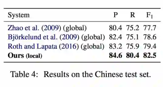 表3和表4分别是作者获得的本文的最优模型与其他系列文章模型的对比,无论是在 Precision,Recall 还是 F1,本文的 GCNs-based SRL 全面取胜。