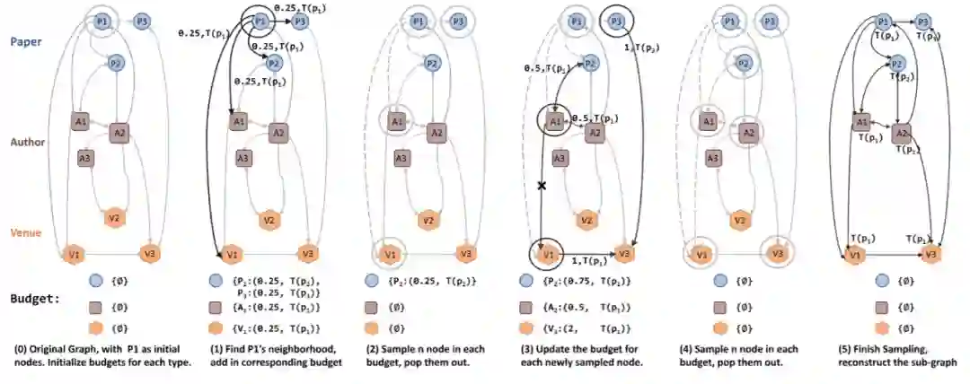 为了处理网络规模的图形数据,我们设计了针对异构图的采样算法 HGSampling。它的主要思想是样本异构子图中不同类型的节点以相同的比例,并利用重要性采样降低采样中的信息损失。
