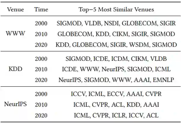 同时,利用我们提出的相对时间编码(RTE),我们可以动态地计算出任意一个年份的节点标准。例如,我们可以观测出每个会议在不同时间其相似会议的变化。如下图所示,WWW 在 2020 年与一些网络、数据库的会议更接近,而在 2020 年却与一些数据挖掘的会议更接近。