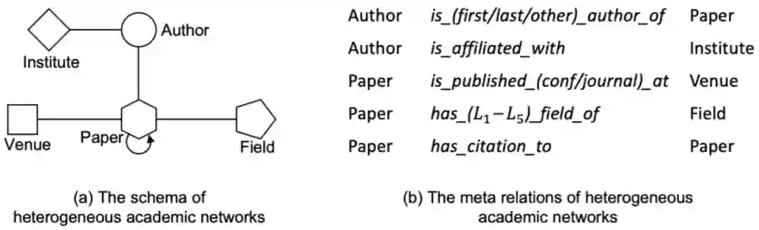 比如学术网络、知识图谱,乃至物联网等。例如,下图中的开放学术网络包含五种类型的节点:论文、作者、机构、会议和领域,以及它们之间不同类型的关系。