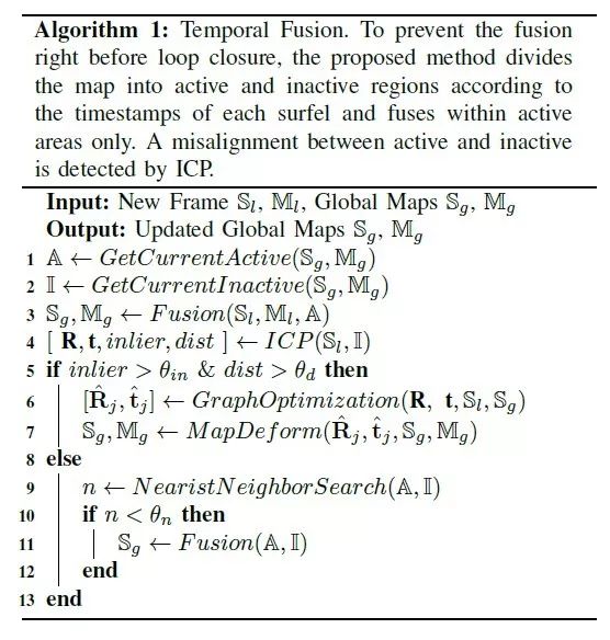 根据timestamp可以选取激活区域和非激活区域,在其中可以利用ICP来检测重叠或误匹配区域。融合算法如下: