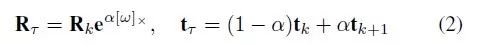 其中R,t通过timestamp相邻的两个时刻k,k+1的位姿进行内插给定: