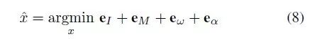其中,a和上加横线的w为IMU的加速度和角速度信息,g为重力加速度,R,t,w为内插得到的旋转,平移和角速度信息,两个b为IMU的biases。