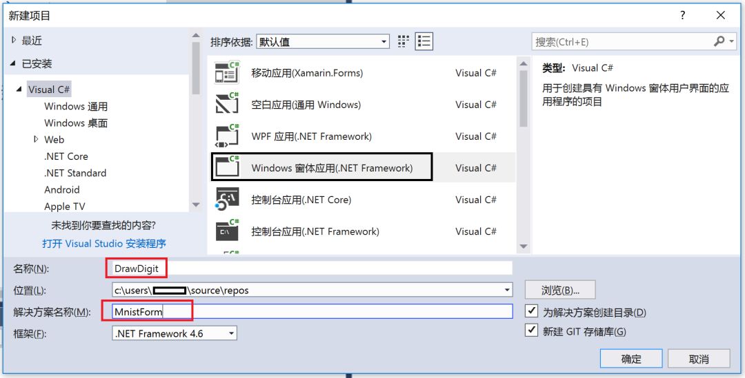 在弹出的窗口里选择 Visual C#->Windows窗体应用,项目名称不妨叫做 DrawDigit,解决方案名称不妨叫做 MnistForm,点击确定。