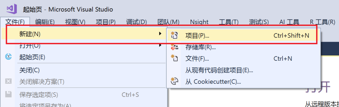 首先,我们打开 Visual Studio,选择文件->新建->项目。