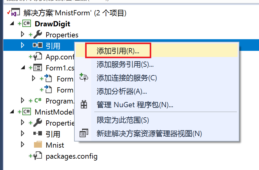首先,我们来给 DrawDigit 添加引用,让它能使用 MnistModel。在 DrawDigit 项目的引用上点击鼠标右键,点击添加引用,在弹出的窗口中选择 MnistModel,点击确定。