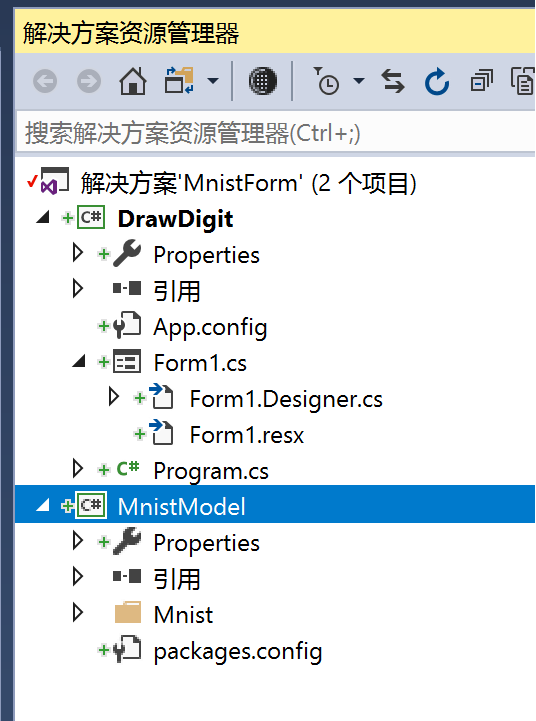 这样,在解决方案资源管理器里,在解决方案 MnistForm 下,就多了一个 MnistModel: