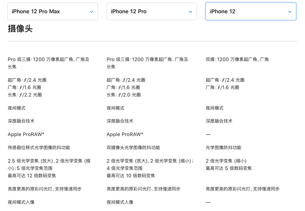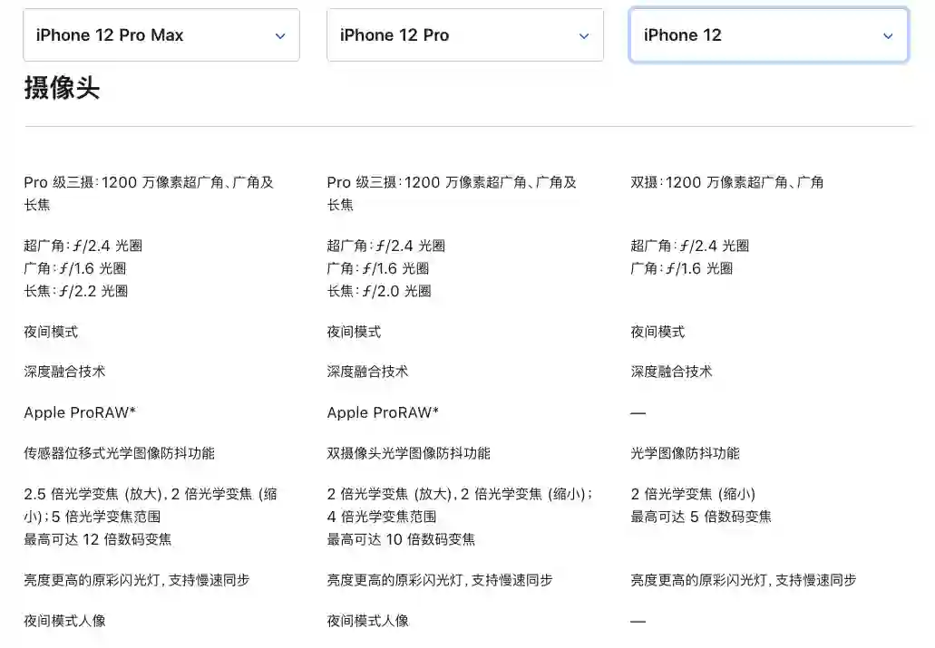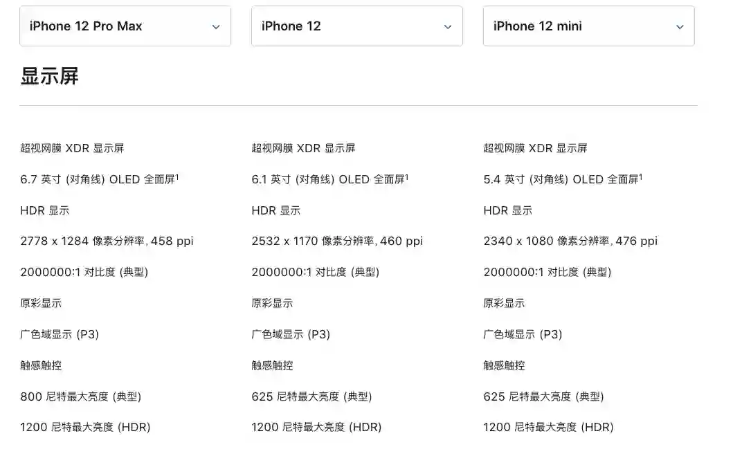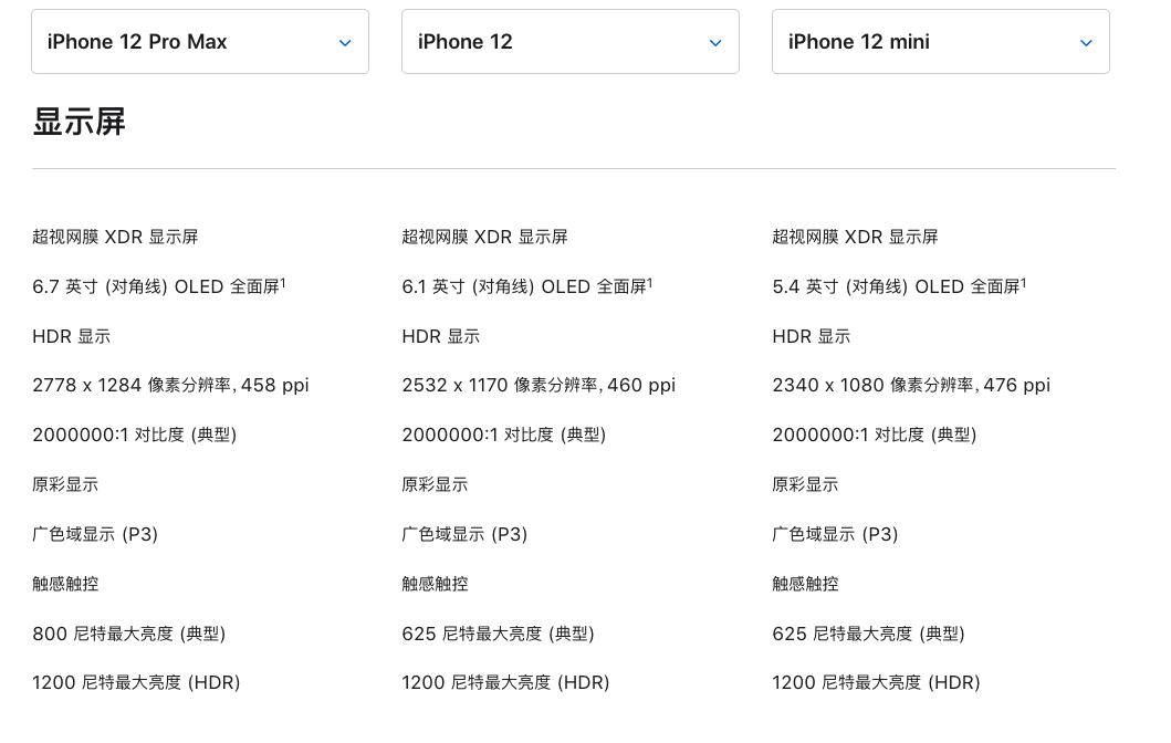就连在 iPhone 11 系列区别最大的屏幕分辨率,在新的iPhone 12 系列上,也用的是同一个档次的屏幕,只有屏幕最大亮度 Pro 系列要高一点,由 iPhone 12 的 625 尼特升级到了 800 尼特。其他比如HDR显示、2000000:1的对比度、超瓷晶面板等参数和硬件,都没有差别。