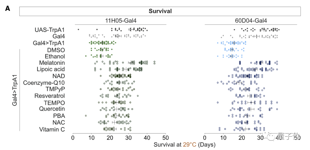 于是接下来,研究人员还通过基因控制,让果蝇的肠道大量产生抗氧化酶,去除ROS。同时,设置对照组,让果蝇针对神经系统的抗氧化酶过度表达。
