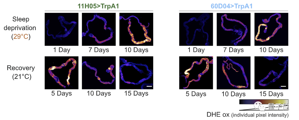 实验表明,ROS的累积会在睡眠剥夺的第10天左右达到峰值(下图第一行)。如果停止睡眠剥夺,ROS水平则会降低(下图第二行)。