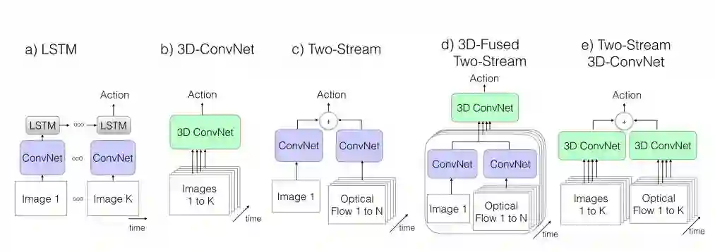 这篇论文基于 C3D。作者在双流架构中使用了 2 种不同的三维网络而不是单个三维网络。另外,为了利用预训练二维模型的优势,作者在第三维中重用了二维预训练权重。空间流输入现在包括时间维度堆积的帧而不是基础双流架构中的单种帧。