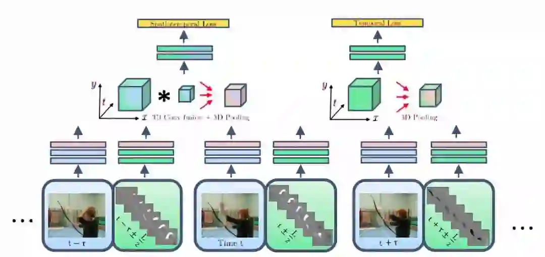 2. 对于时间融合来说,来自时间网络的输出,跨时间堆叠,然后通过 conv+pooling 的融合,是用于时间损失的。融合架构。