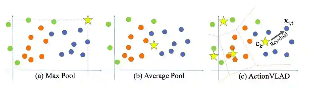 尽管最大池化或者平均池化对于相似的特征表现良好,但它们并没有充分地捕捉到完整的分布特征。ActionVLAD 聚集了外观和运动特征,并从最近的集群中心聚集其余特征。来源(https://arxiv.org/pdf/1704.02895.pdf)