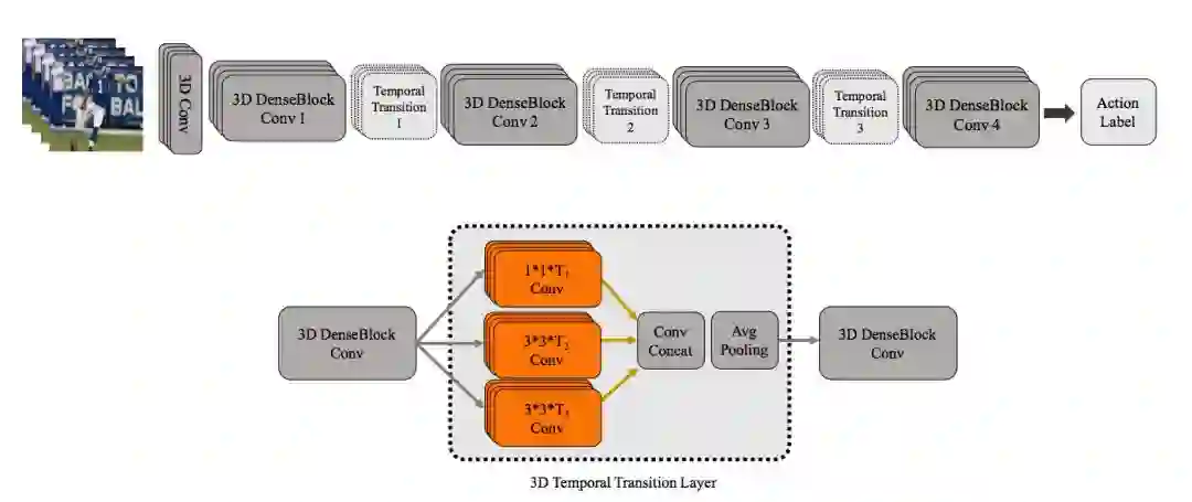 解释:作者扩展了 I3D 上所做的工作,但建议使用基于单流 3D DesnseNet 的架构和在密集块之后堆积的多深度时间聚集层(Temporal Transition Layer)来捕捉不同的时间深度。这个多深度聚集(multi depth pooling)是通过变化的时间规模核心的聚集来实现的。