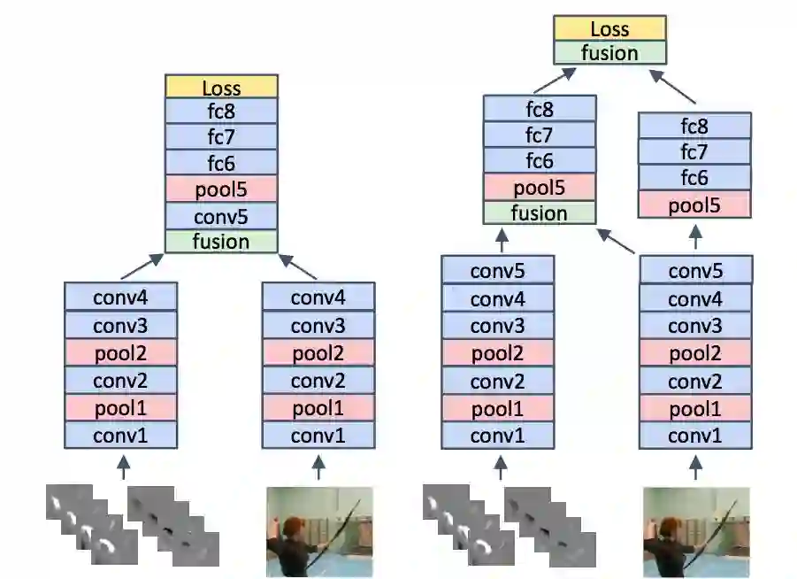 用于融合空间流和时间流的可能策略。右边的策略表现更好。来源(https://arxiv.org/abs/1604.06573)