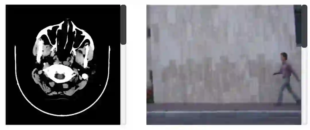 图 1: 左图:头部 CT 扫描示例。右图:来自动作识别数据集的示例视频。CT 容积图中的 Z 维和视频中的时间维度类同。