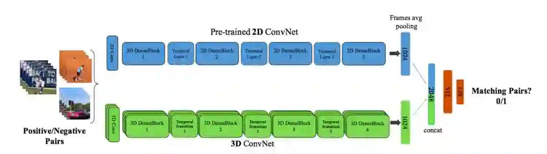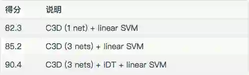 作者基于 Karpathy et al. 的论文(single stream)构建了这篇论文。然而,他们在视频音量上使用三维卷积算法,而不是跨帧使用二维卷积算法。其理念是在 Sports1M 上训练这些网络,然后使用它们(或者一套拥有不同时间深度的网络)作为其它数据集的特征提取器。他们的发现是一种类似 SVM 的基于全套提取特征的简单线性分类器,比现有最好的算法更有效。如果使用类似 iDT 的人工特征,这个模型会表现得更好。