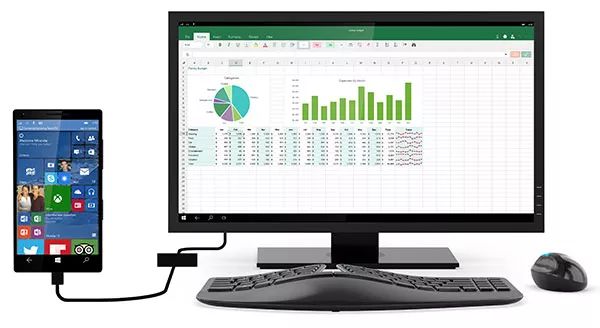 不得不提一下移动版 Windows 10 的 Continuum 模式,通过微软盒子连接手机,就能让手机在显示器上转换为模拟 PC 端界面,它瞄准的是近几年风靡的“轻办公”趋势,类似方案还有三星 S8 的 Dex 和华为 Mate10 的 PC 模式。不过遗憾的是,它仍然不是真正的 PC 系统。