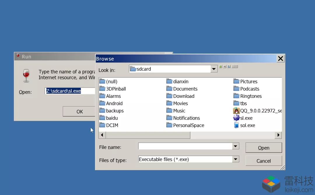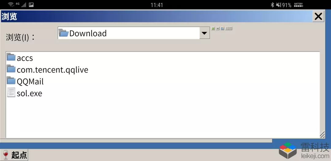 如果没有蓝牙键盘,点击“浏览”,调出打开文件的窗口,也能找到拷贝好的 exe 文件。但是,无法通过触摸屏直接点击文件名来打开。此时,你又需要一个支持安卓系统的蓝牙鼠标,双击该文件名后回到运行窗口,这时输入框已经生成路径。