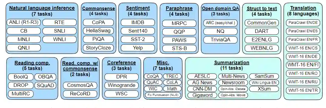 有的数据集几乎没有训练样本,例如CommitmentBank只有250个样本,为了防止这些数据集被边缘化,遵循样本比例混合方案(examples-proportional mixing schema),在最大混合率为3000的情况下,使用Adafactor优化器以3e-5的学习率,以8192的batch size对所有模型进行30000次梯度更新的微调。