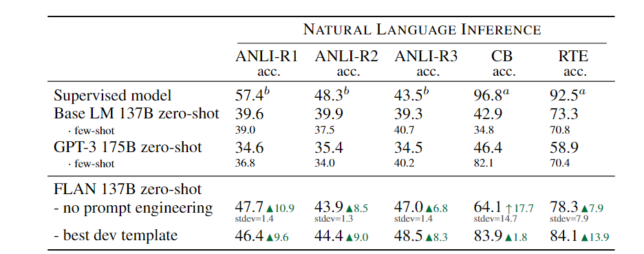 FLAN甚至在ANLI、RTE、BoolQ、AI2-ARC、OpenbookQA和StoryCloze上的表现都大大超过了 few-shot GPT-3。
