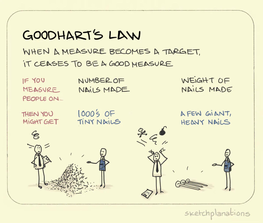 Goodhart定律内容:当一个措施本身成为目标时,它就不再是一个好的措施。