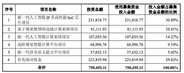 招股书显示,本次募资将主要用来投入芯片相关技术和产品的研发。其中有23.18亿元用于新一代人工智能IP及高性能SoC芯片项目,8.11亿元用于基于视觉推理的边缘计算系统项目,10.7亿元用于新一代人工智能计算系统项目。
