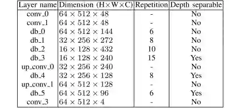 完整的网络参数见表1,各层的卷积核尺寸均为3x3,而最后一层是1x1的卷积用于通道变换。在dense block中,增长率参数设为16。