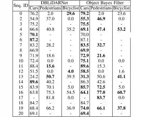了解环境的语义特征是机器人自主运行的关键因素。在本文中,作者提出了一种深度卷积神经网络(DCNN),用于将LiDAR扫描数据语义分割为汽车,行人或骑车的人。该架构基于dense blocks,并有效利用深度可分离卷积来限制参数数量,同时仍能保持最先进的性能。为了使DCNN的预测在时间上一致,作者提出了一种基于贝叶斯滤波的方法。该方法使用神经网络的预测输出来递归地估计扫描数据中的点的当前语义状态。该递归估计使用从先前扫描获得的知识,从而使得预测在时间上一致并且对孤立的错误预测具有鲁棒性。作者将提出的架构性能与其他最先进的神经网络架构进行了比较,并提出了实质性的改进。对于所提出的贝叶斯滤波器方法,作者在KITTI跟踪基准测试中展示了各种序列的结果。