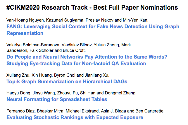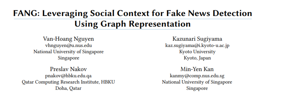 第29届国际计算机学会信息与知识管理大会(The 29th ACM International Conference on Information and Knowledge Management, CIKM 2020)于2020年10月19日-10月23日在线上召开。CIKM是CCF推荐的B类国际学术会议,是信息检索和数据挖掘领域顶级学术会议之一。本届CIKM会议共收到投稿920篇,其中录用论文193篇,录取率约为21%。本篇介绍来自NUS关于利用图表示假新闻检测工作,获得最佳长论文!