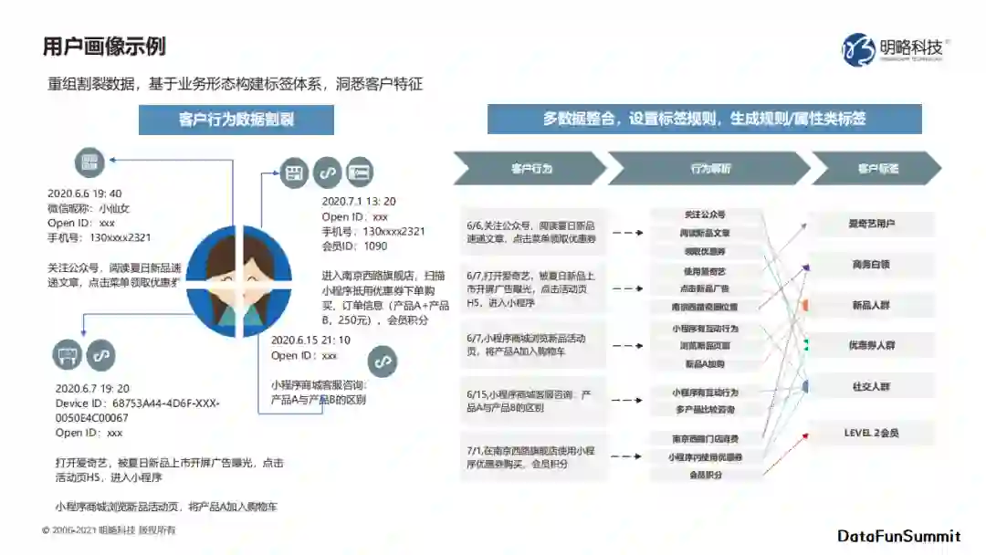 最后结合我们的用户画像产品,举一个简单的例子。当今很多企业可能会有多个触点来获得用户行为,在左边的图中,有四个触点,因此形成的用户的多个碎片化的信息:可能是关注了公众号,通过一次广告点击进入到了活动主页,然后在小程序里面进行了一些咨询,最后线下购买。我们通过不同渠道,获得了用户的行为。当我们把这些行为串联起来去看的时候,可以直接从行为中提取一些事实标签,例如关注了公众号,那就是“xx公众号的读者“,使用爱奇艺,可能是“xxAPP的使用者”,关注了新品,因此是“xx新品的关注者”,这些都是比较直观的解析。通过这些直观的解析,再经过模型的计算,我们就可以得到一些深层次的标签,例如,商务白领。怎么推断出来的?用户在南京西路商圈活动,同时还在这个地方消费。假如用户只是去看一看,不买,我们可能也推断不出来,但用户既在附近活动,又消费,我们就能做一个推断,用户是一个商务白领等等。结合这种行为解析,就可以产生高层次标签。