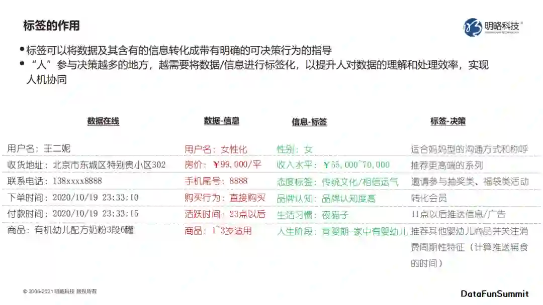根据标签如何产生决策?在电商场景,用户购买了一款婴儿奶粉产品,接下来该如何去跟他互动?我们结合性别女的标签,去判断,用户大概率是一个妈妈,就应该是适用妈妈型的沟通方式和称呼。这个当然也有可能会有错,比如用户是帮别人买的,送人的。因此可能会要结合多种标签应用,帮助我们决策用什么方式去和用户进行沟通。在这个环节中,并不要求决策百分之百正确。因为大多数业务只是需要一个可以尝试的推荐。接下来每一条数据都是这样的,比如通过数据在线,获得了收货地址,东城区特别贵小区302,通过信息增益补充了房价信息,然后再结合收入和房价模型,就能大概推断出用户的大概收入水平,生成收入水平标签。有了收入水平标签后,能进一步指导决策:对于收入水平比较高的用户,推荐更高端的产品系列。这就是一个典型的,通过数据转化为标签,最终指导决策的过程。