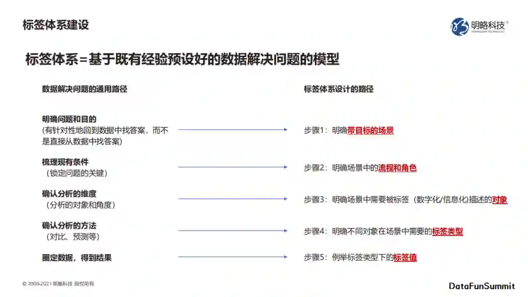 以上五步,就是用数据去解决问题的通用途径。制定标签体系设计路径的时候,也是类比通用路径,因此也有五个步骤。