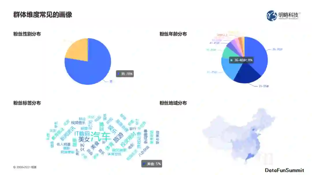 前面在定义阶段,我们说画像其实是一种可视化的展现,但是这个展现的形式不是单一的。举个例子,对微博上某个车评人的粉丝情况的分析,和刚刚单一用户的画像就很不一样。单一用户画像,更多的是把每一个属性进行分类和排列,帮助我们了解某一个单独对象的信息。而针对群体的画像,更多的是将单一标签类型汇聚在一起,去展示统计信息(也就是标签、标签值的分布),比如说性别里面男女各占多少比例,地区里每个省份所占的比例,或者是每个省份的热度是多少等等。而在处理连续的值,或者说比较多的离散值的时候,我们也可以去进行分段,比如说右上角年龄,可以针对典型的年龄段进行划分,至于具体怎么去划分,则是业务强相关了。
