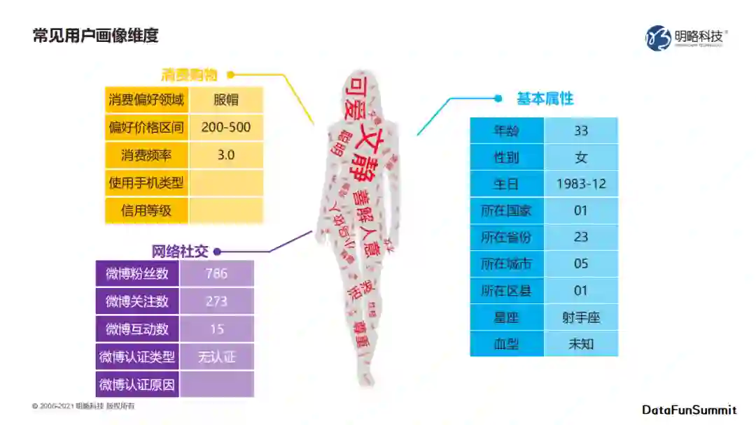结合这张图:蓝色的像年龄、性别、所在的区域,都是一些比较通用的基本属性,可能在多个场景中使用到。这类标签通常是会再去配合其他标签去使用。而左上角黄色的消费购物类的标签,可能在电商场景中会用的比较多。根据用户的标签,比如消费偏好领域为服贸,我们判断用户可能购买服装类的物品会比较多,因此在进行推荐或者是促销的时候,可以优先挑服装鞋帽等品类推送给用户。但如果不考虑这些标签,而去给用户推荐一些3C电子类的产品,用户可能会完全不感兴趣,也就起不到促进购买的作用。