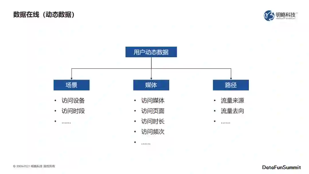 动态数据是用户不断变化的行为信息。我们可能会更多地聚焦在用户在互联网上的行为,比如在浏览了某品牌的网页,浏览了某一个品类的一个单品页,或是发了一条微博等等这些信息,这种就是动态数据。