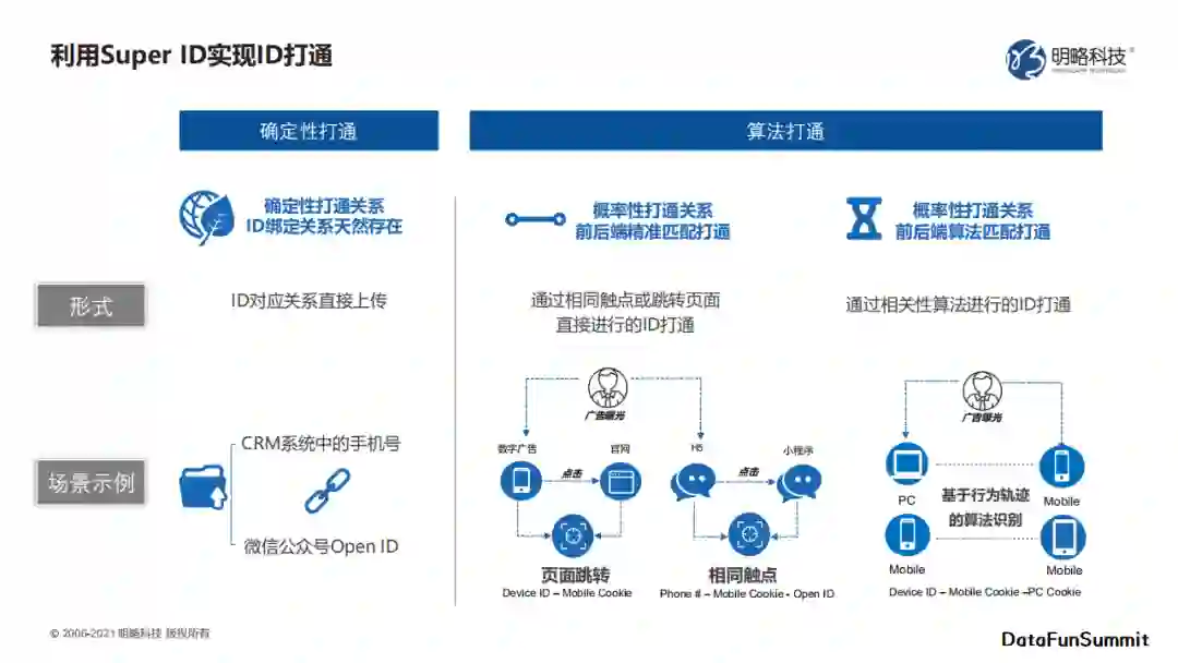 在明略的解决方案中,我们围绕用户构建了一个SuperID,通过一些确定性的绑定关系和一些不确定性的匹配关系,将这些多种渠道获得的ID围绕Super ID形成连接,最终实现多个渠道多个ID的打通,这样就可以将多个渠道获得的用户行为数据进行连接,来支撑模型标签和预测标签的计算。