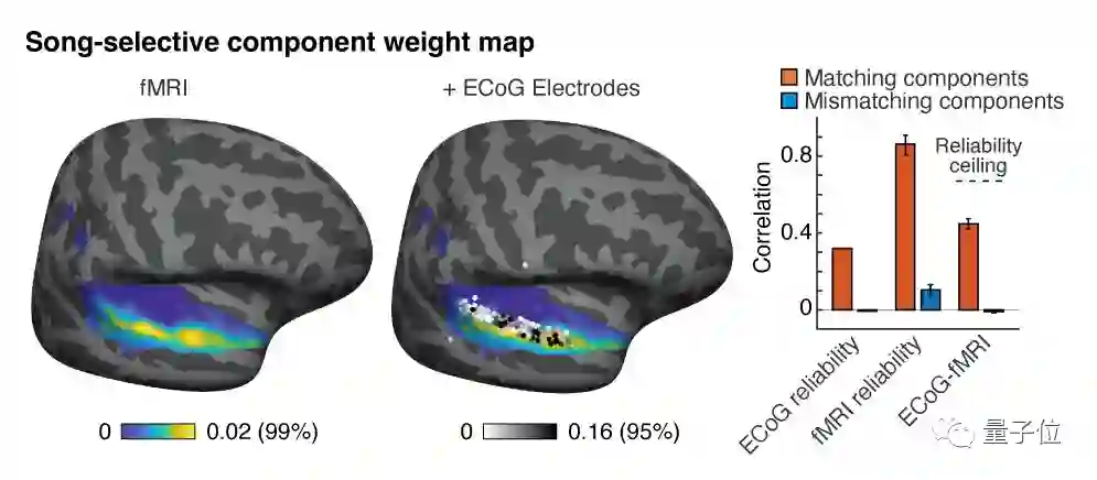 当然,他们并没有抛弃核磁共振,而是将平均时间内的ECoG元素投影到核磁共振的体素(Voxel)上,得到更精确、密集的空间映射图: