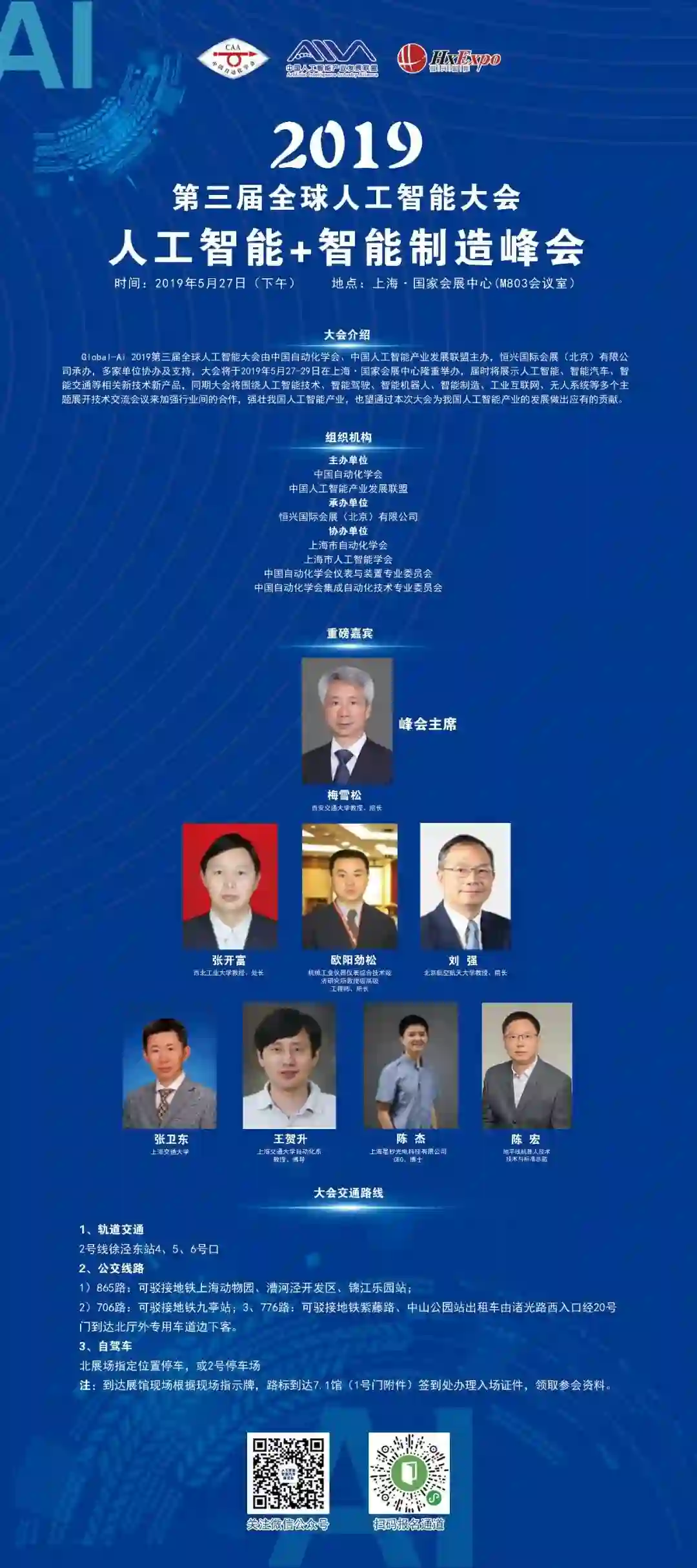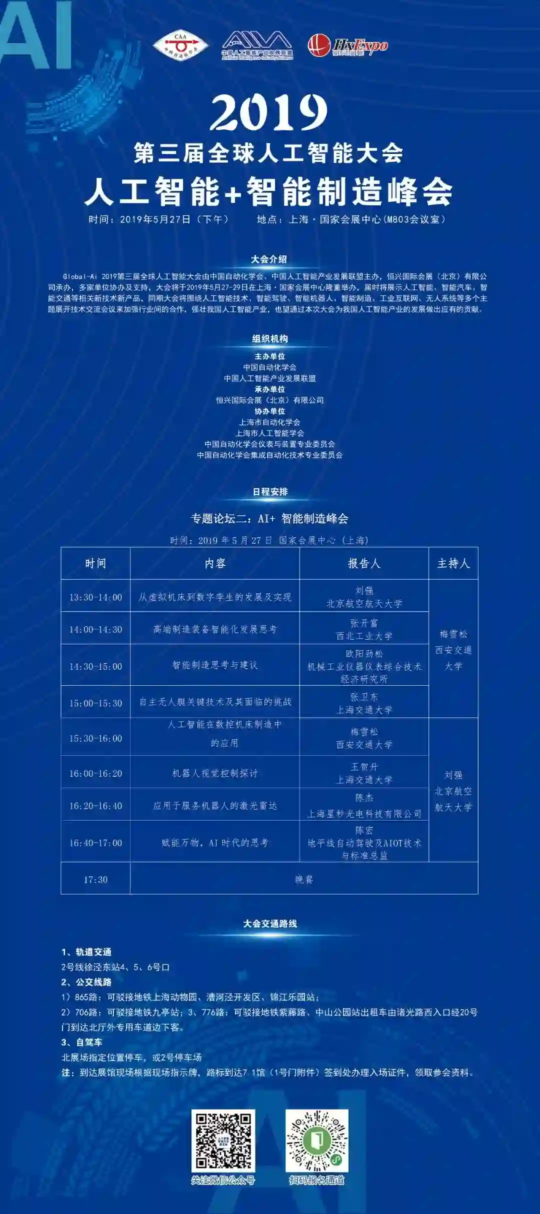 Global-Ai 2019第三届全球人工智能大会由中国自动化学会、中国人工智能产业发展联盟主办,恒兴国际会展(北京)有限公司承办,多家单位协办及支持,大会将于2019年5月27-29日在上海·国家会展中心隆重举办,届时将展示人工智能、智能汽车、智能交通等相关新技术新产品,同期大会将围绕人工智能技术、智能驾驶、智能机器人、智能制造、工业互联网、无人系统等多个主题展开技术交流会议来加强行业间的合作,强壮我国人工智能产业,也望通过本次大会为我国人工智能产业的发展做出应有的贡献。