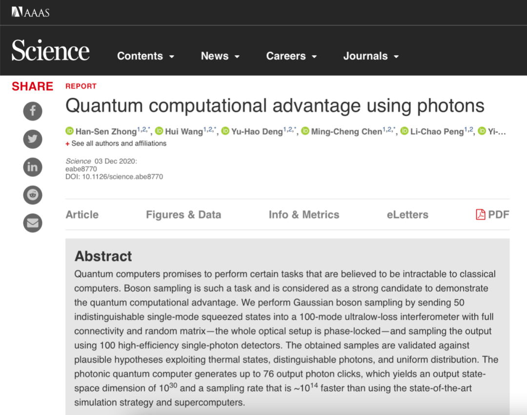 12月4日,中国科学技术大学潘建伟、陆朝阳等组成的研究团队发布了一项重磅研究成果:构建的76个光子的量子计算原型机“九章 ”,实现了具有实用前景的“高斯玻色取样”任务的快速求解。