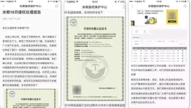 11月2日,米熊在平台上发布10月侵权处理报告:自项目上线以来,共对1371条视频进行TSA可信任时间戳认证……在针对网络盗版打击的过程中,10月共计发现网络盗版242条,已处理盗版81条,盗版视频主要分布为闲鱼、淘宝等地。