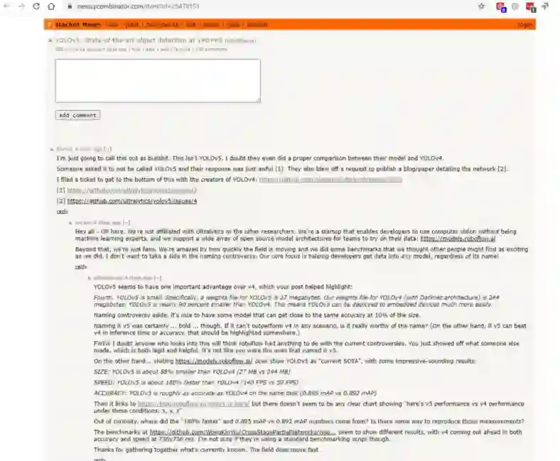 在这个 GitHub 页面中(现已关闭),有两个宣称 YOLOv5 已经问世的链接。这两个链接分别指向 Ultralytics YOLOv5 代码库和前面提到过的 Roboflow 博客。然后还有另一个链接是 Y-Combinator 上对以上两个信息源的讨论:https://news.ycombinator.com/item?id=23478151
