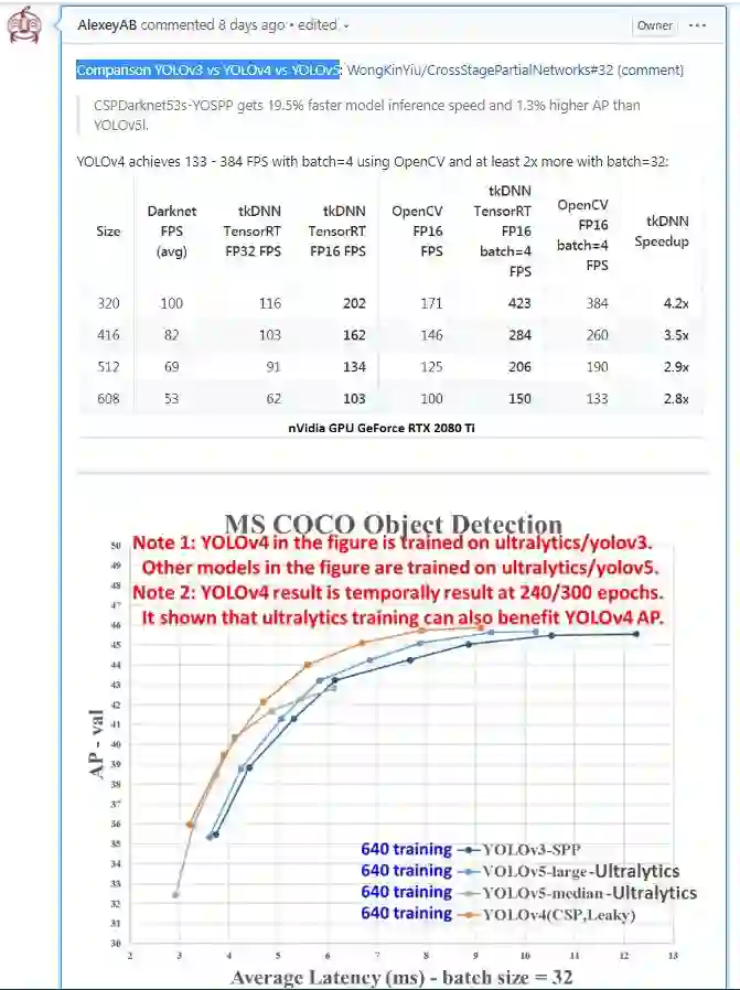 「YOLOv5 其实就是 YOLOv3 换了个名字。图表看起来是不错,但会误导人。」然后他提供了一个指向 YOLOv4 的作者 AlexeyAB 的代码库的链接:GitHub.com/AlexeyAB/darknet/issue/5920。