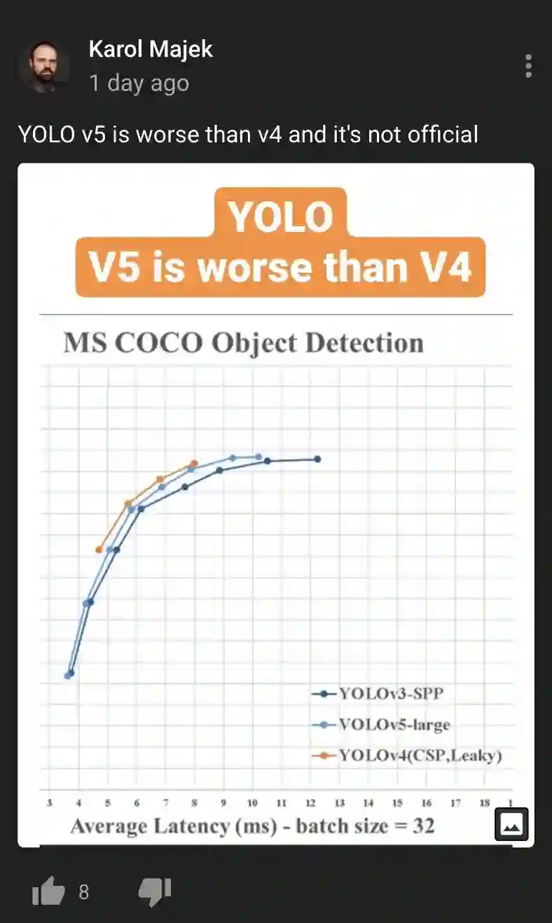 Joshvm 猜测说:「我认为 YOLOv5 没有给出有信息的说明。但顺便说一句,如果你之前看过那些问题,你就知道 AlexeyAB 的分叉基本上已经解决这些问题了,因此会有版本冲突。Ultralytics 可能原本打算将其命名为 YOLOv4。这个软件库已经开发有一段时间了。」